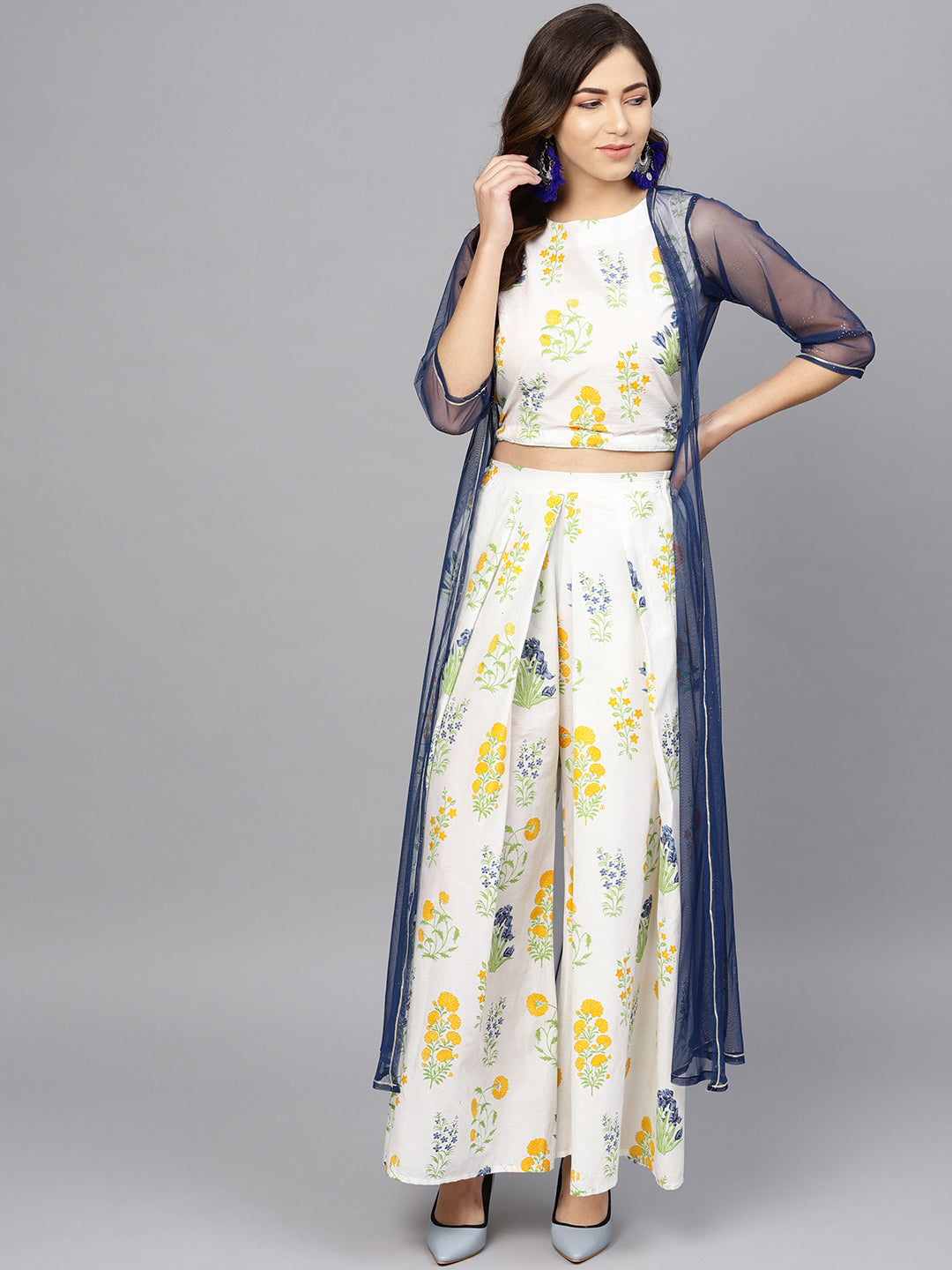 Ahalyaa Women White & Blue Printed Crop Top with Palazzos & Ethnic Jacket