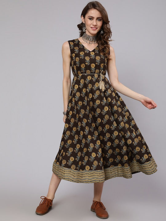 AKS Floral Printed V-Neck Sleeveless Gathered Pure Cotton Fit & Flare Midi Dress