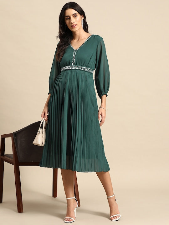 - Green solid a-line dress