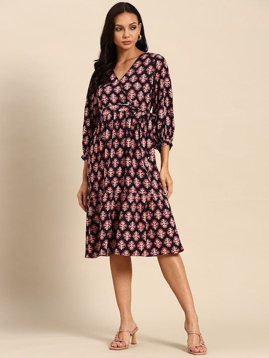 - Navy blue and maroon ethnic motifs print wrap dress dress
