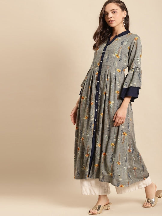 All about you Grey Floral Printed Mandarin Collar Bell Sleeves A-Line Kurta