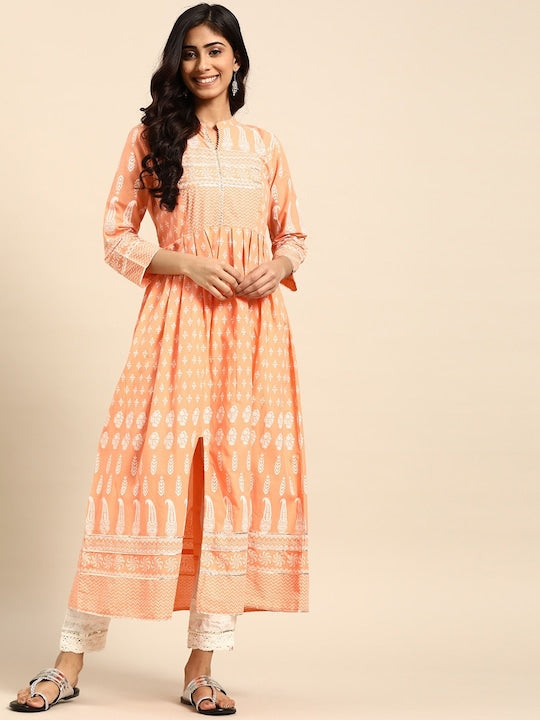 All about you Peach-Coloured Ethnic Motifs Printed Gotta Patti Detail Cotton A-Line Kurta