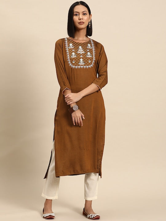 - You'll love the style, comfort and durability of this ALL ABOUT YOU kurta. Dress up for your next family event by pairing this brown kurta with your best Kolhapuris and simple jewellery.