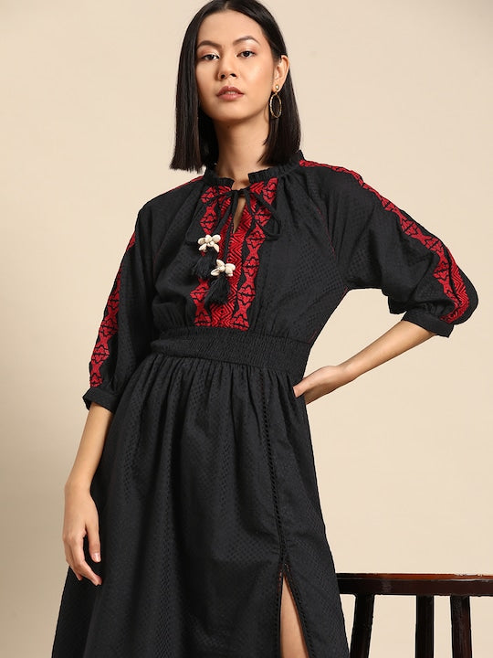 All about you Smocked Dobby Woven Embroidered Tie-Up Neck A-Line Midi Dress