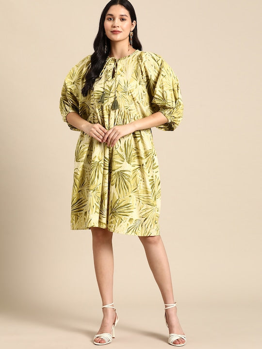All about you Tropical Print Tie-Up Neck Cotton A-Line Dress