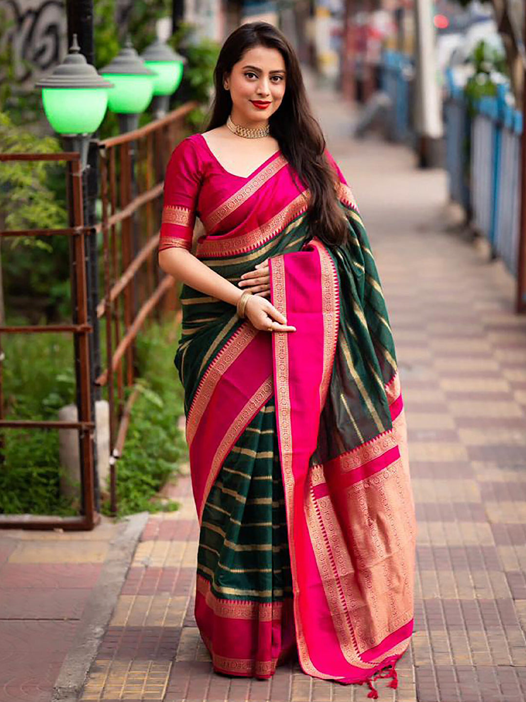 - Green and pink banarasi saree