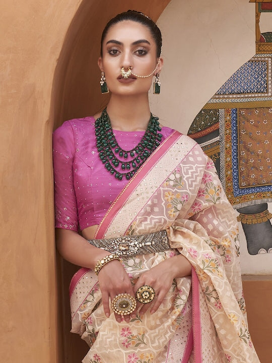 Anouk Cream Coloured & Pink Floral Printed Gotta Patti Organza Saree