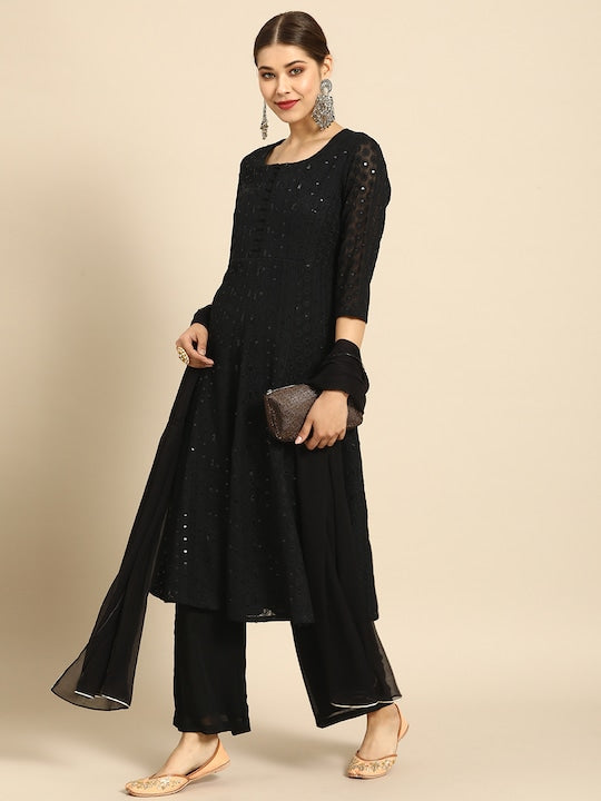 Anouk Women Black Ethnic Motifs Embroidered Panelled Anarakli Kurta Palazzos Dupatta