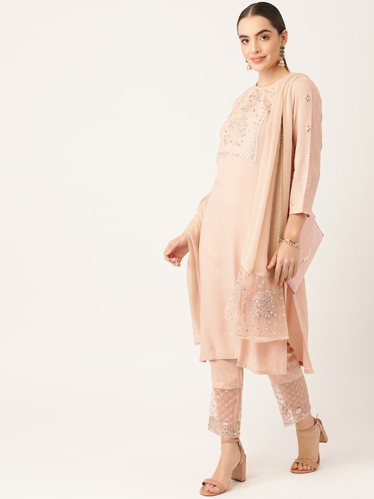 Anouk Women Peach Coloured Yoke Design Mirror Work Kurta with Trousers & With Dupatta