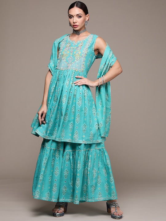 Anubhutee Women Blue Ethnic Motifs Printed Pure Cotton Kurta with Sharara & With Dupatta
