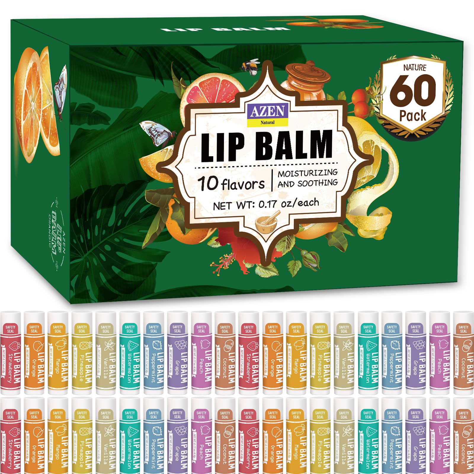 AZEN 60 Pack Lip Balm, Natural Lip Balm Bulk, Lip Care Product, Moisturizing Lip Balm for dry cracked lips - 10 Flavors