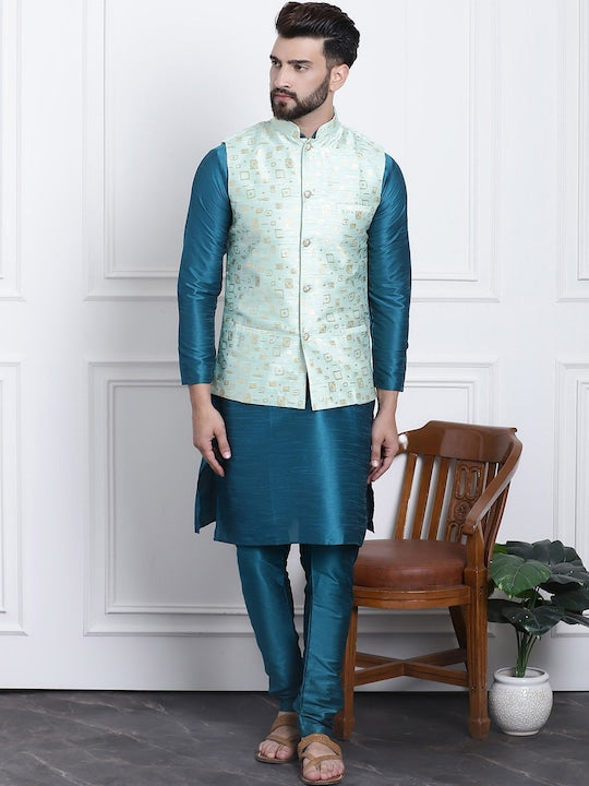 Sojanya Band Collar Straight Kurta & Churidar with Nehru Jacket