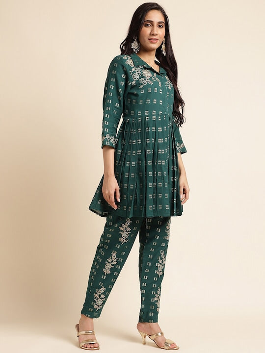 Fabmora Ethnic Motif Woven Design Thread Work Organic Cotton A-Line Kurta & Trousers