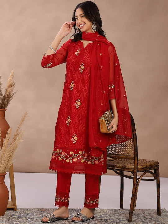 Fabmora Women Embroidered Regular Thread Work Kurta with Trousers & With Dupatta