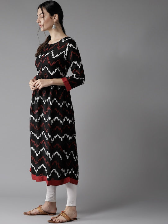 - Black and red printed A-line kurta, has a round neck, three-quarter sleeves, flared hem