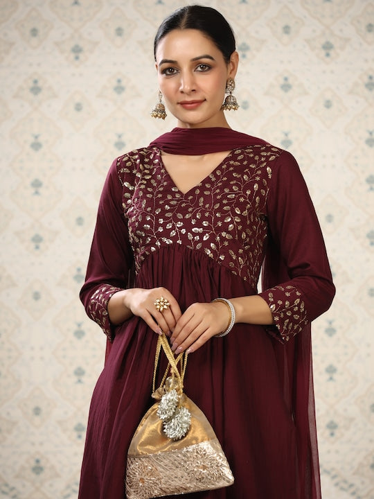House of Pataudi Floral Yoke Design Sequinned Pleated Kurta With Trousers & Dupatta