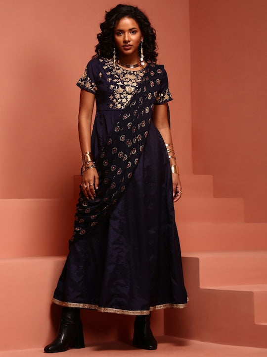 - Introducing our Blue & gold-tone solid A-line ethnic dress with a dupatta, a stunning ensemble that seamlessly blends tradition and modern aesthetics. The maxi length with a flared hem exudes grace, while the embroidered details add an exquisite touch to the solid blue fabric.