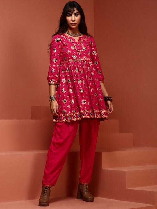 - Elevate your ethnic wardrobe with our Fuchsia & gold-toned longline empire top, featuring intricate ethnic motifs for a touch of cultural richness.