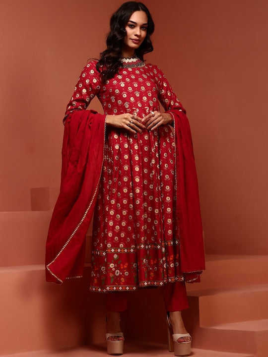 - Radiate elegance in this red and gold-toned printed kurta set adorned with ethnic motifs. The Anarkali-shaped kurta, featuring a round neck and three-quarter regular sleeves, exudes a classic charm with thread work details.