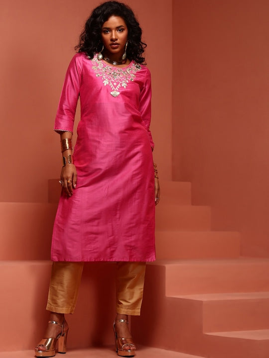 - Enhance your festive wardrobe with the elegance of this pink and gold-toned straight kurta. The floral yoke design and three-quarter sleeves contribute to its graceful appearance.