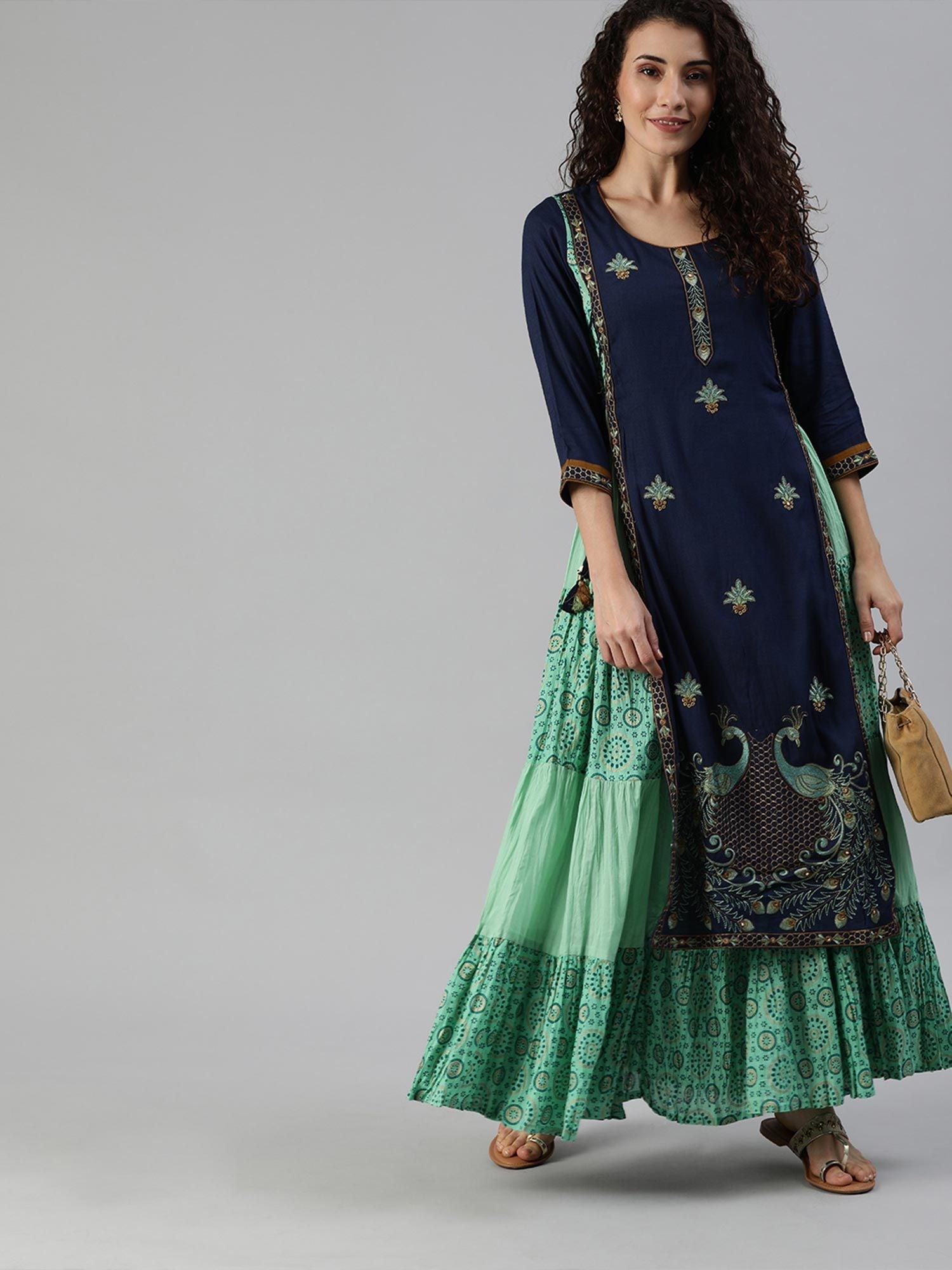 ISHIN Rayon Blue & Sea Green Embroidered Layered Kurta