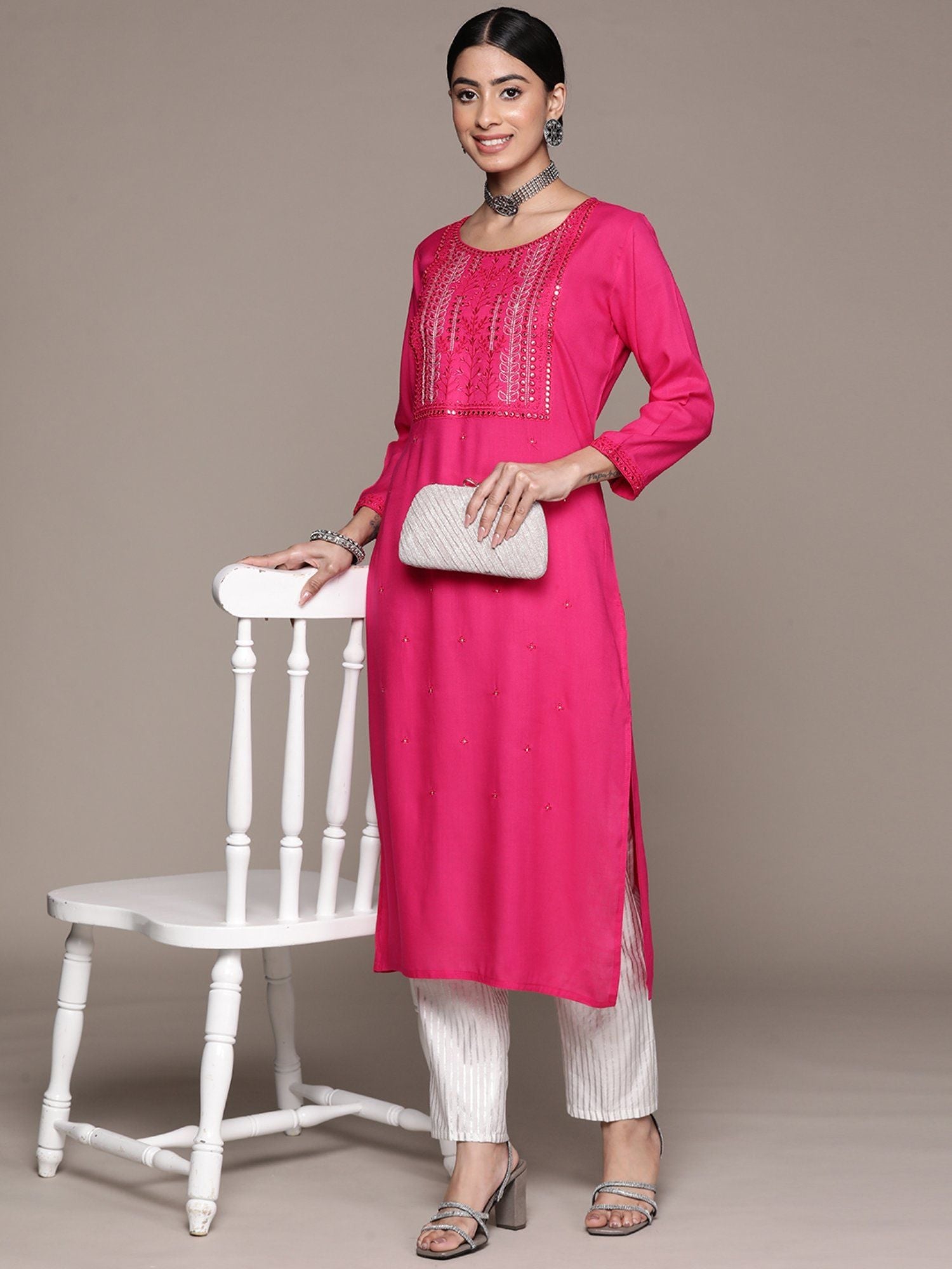 - Make a captivating style statement with the Magenta Embroidered Straight Kurta, featuring a floral yoke design and intricate mirror work for an elegant touch.