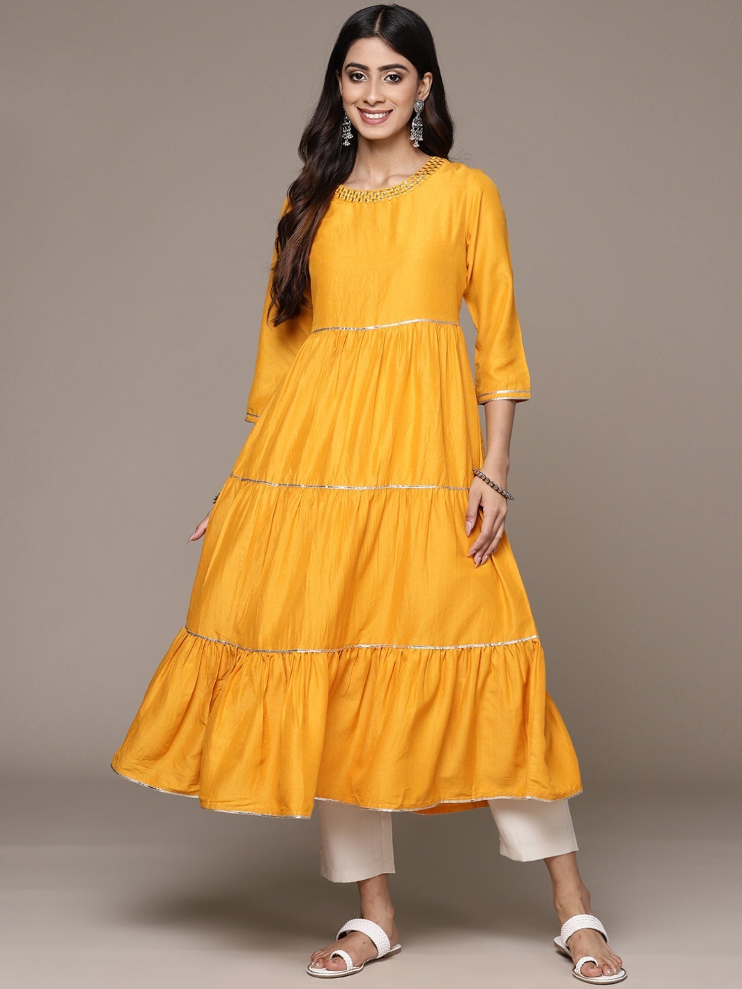 - Crafted from luxurious silk, this anarkali kurta features exquisite mirror work and gota detailing. The tie-up neckline adds a touch of sophistication, making it a must-have for special occasions. The comfortable fit ensures you look and feel fabulous.