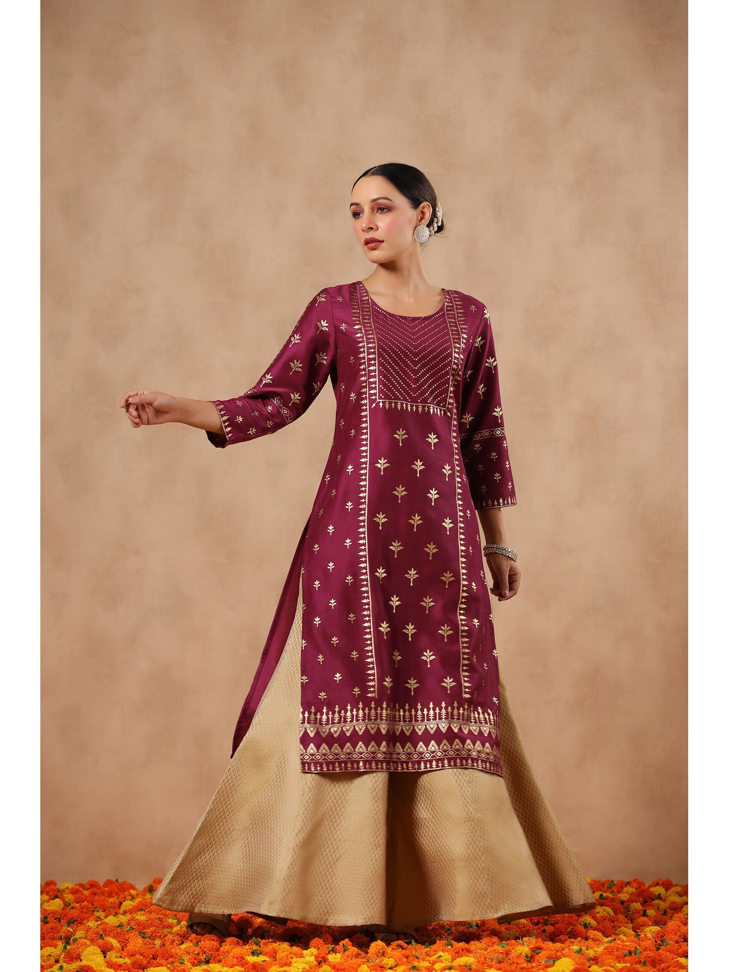 - Embrace the festive spirit with the ISHIN Women's Viscose Rayon Foil Print Wine Straight Kurta, featuring an embellished/sequined pattern for an extra touch of glamour.