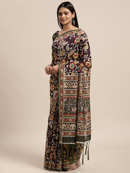 - Brown and beige bagh saree with a floral printed design and printed border.