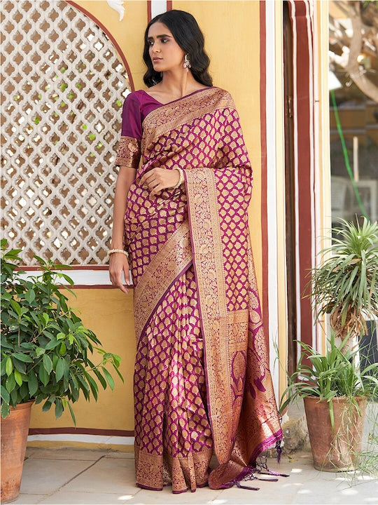 - Purple and gold-toned Banarasi saree with an ethnic motif woven design.