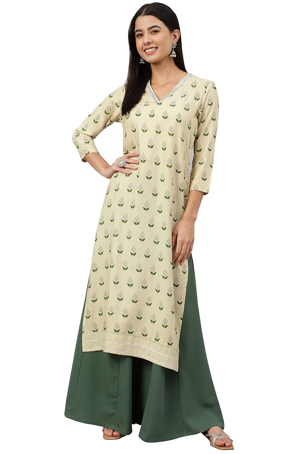 Janasya Women's Beige Rayon Botanical Print Straight Kurta
