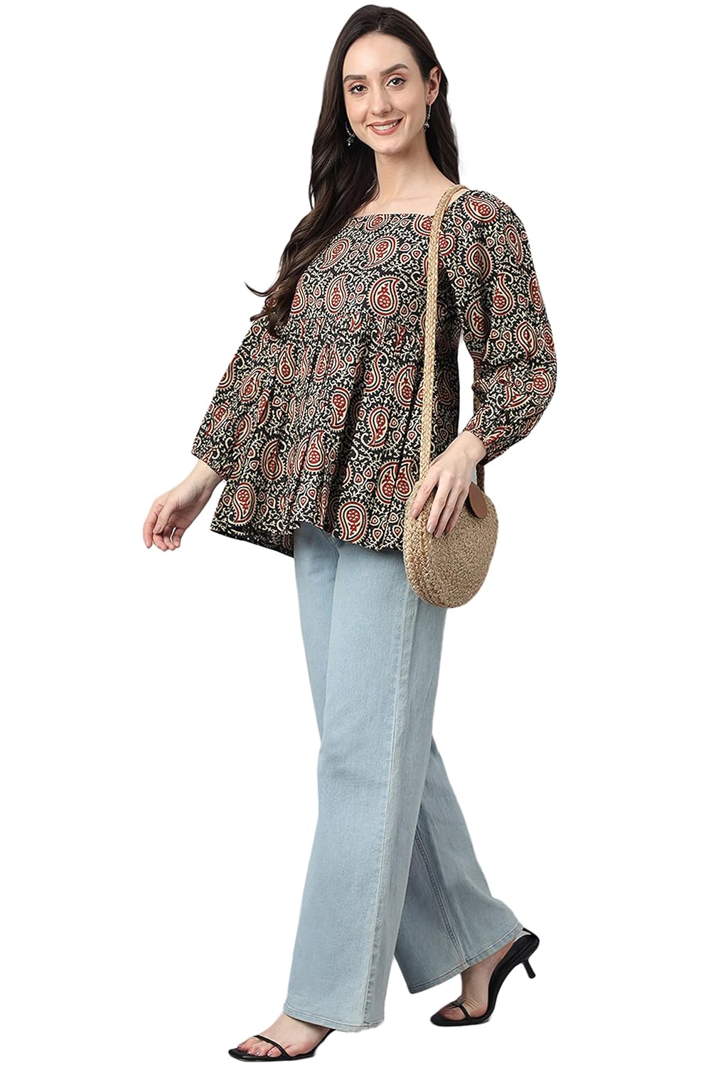 - Elevate your Casual style with this Black Top featuring a 26-inch length, exquisite Paisley Print pattern, and fashionable 3/4 th Puff Sleeves, making it a perfect choice for your day-to-day outings.