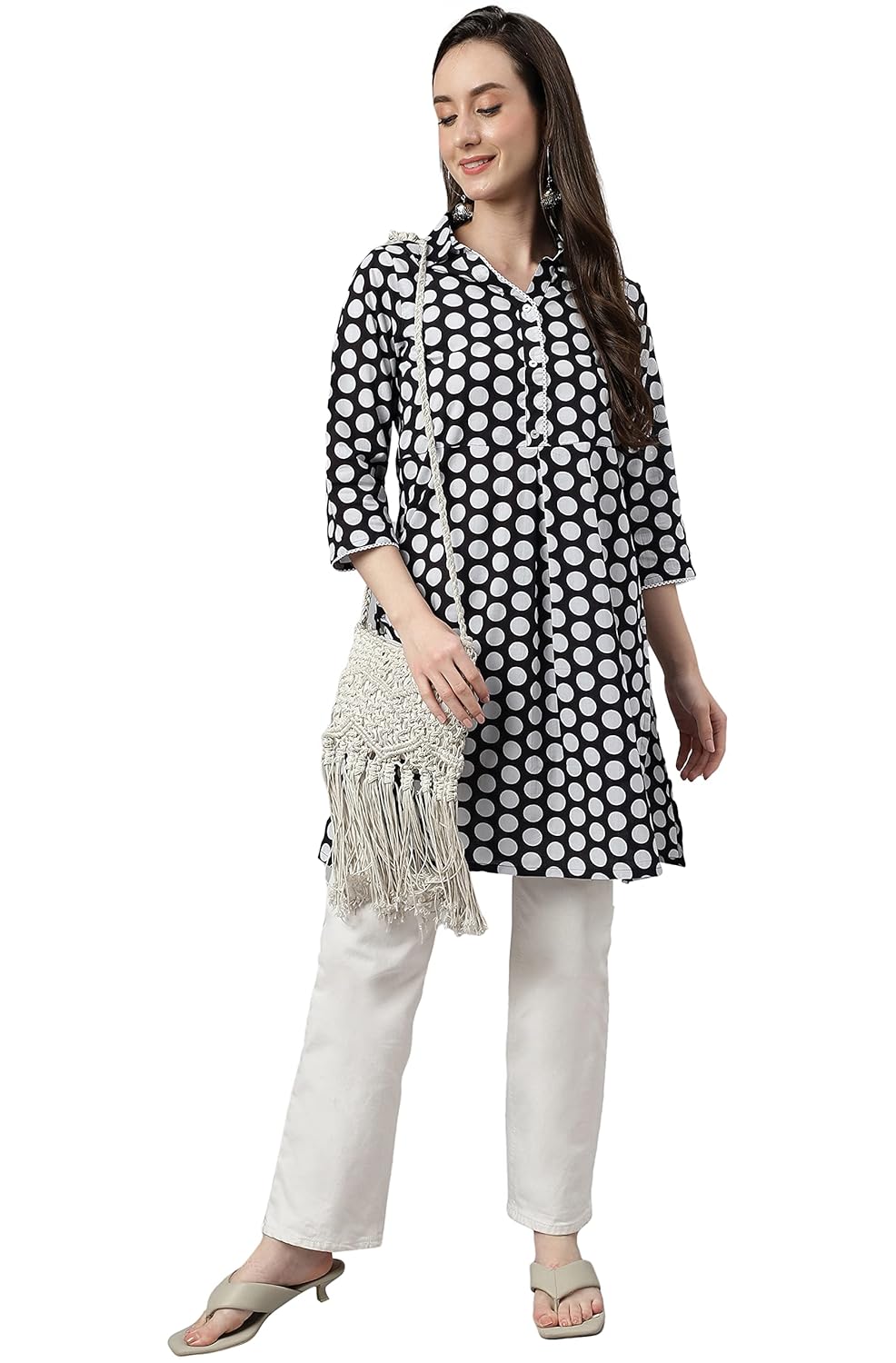 - Elevate your casual style with this Black Cotton Tunic featuring a charming Polka Print. Crafted from 100% Cotton fabric, this A-line tunic offers a regular fit and 3/4 sleeves (Regular Sleeves) for both comfort and fashion.