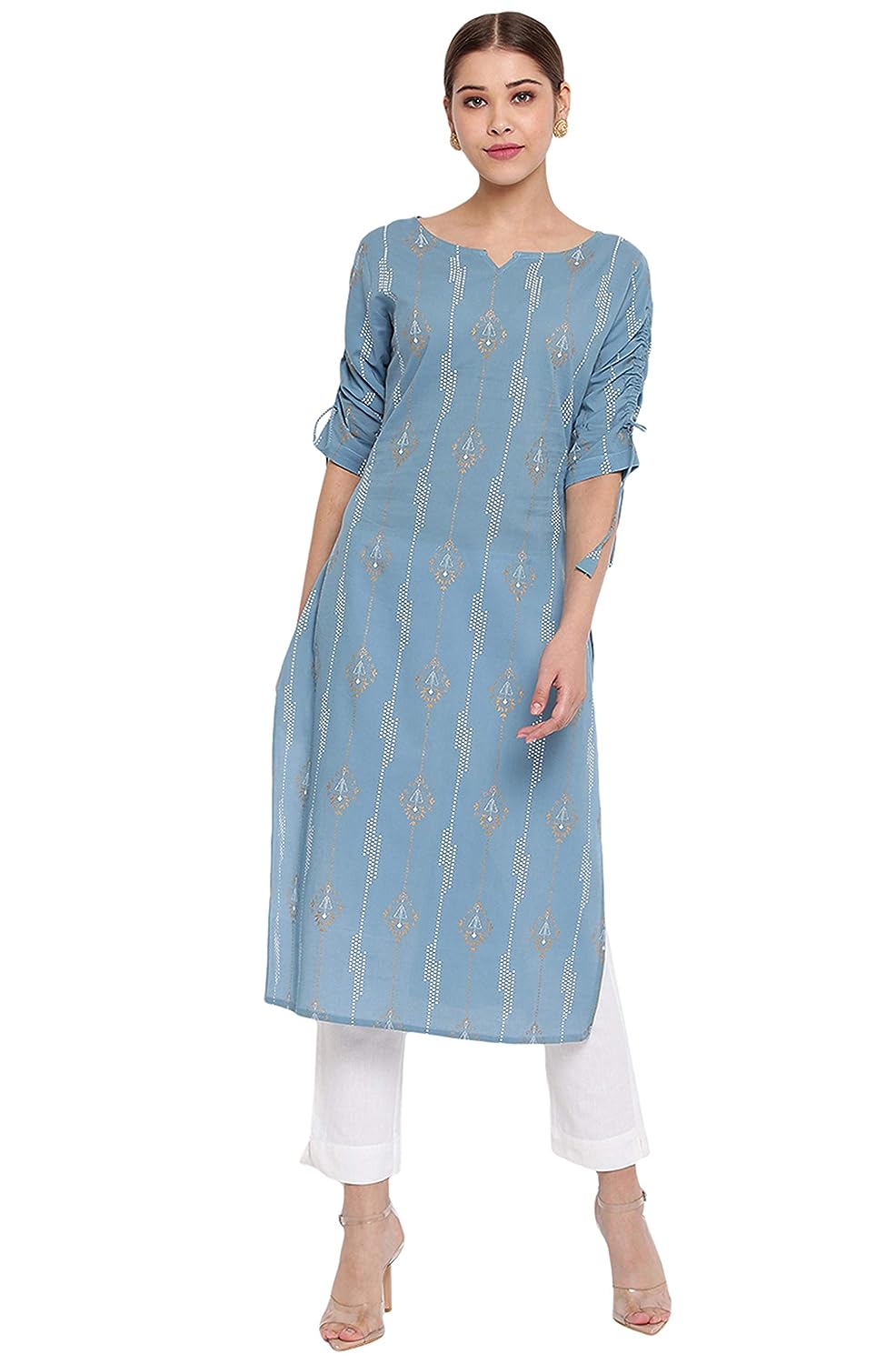 - Elevate your casual style with this beautiful blue kurta, featuring ethnic motifs that add a touch of tradition to your look. The kurta is crafted from 100% cotton fabric, ensuring comfort and breathability throughout the day. It has a regular fit with a length of 44 inches and 3/4 sleeves, making it suitable for various casual occasions.