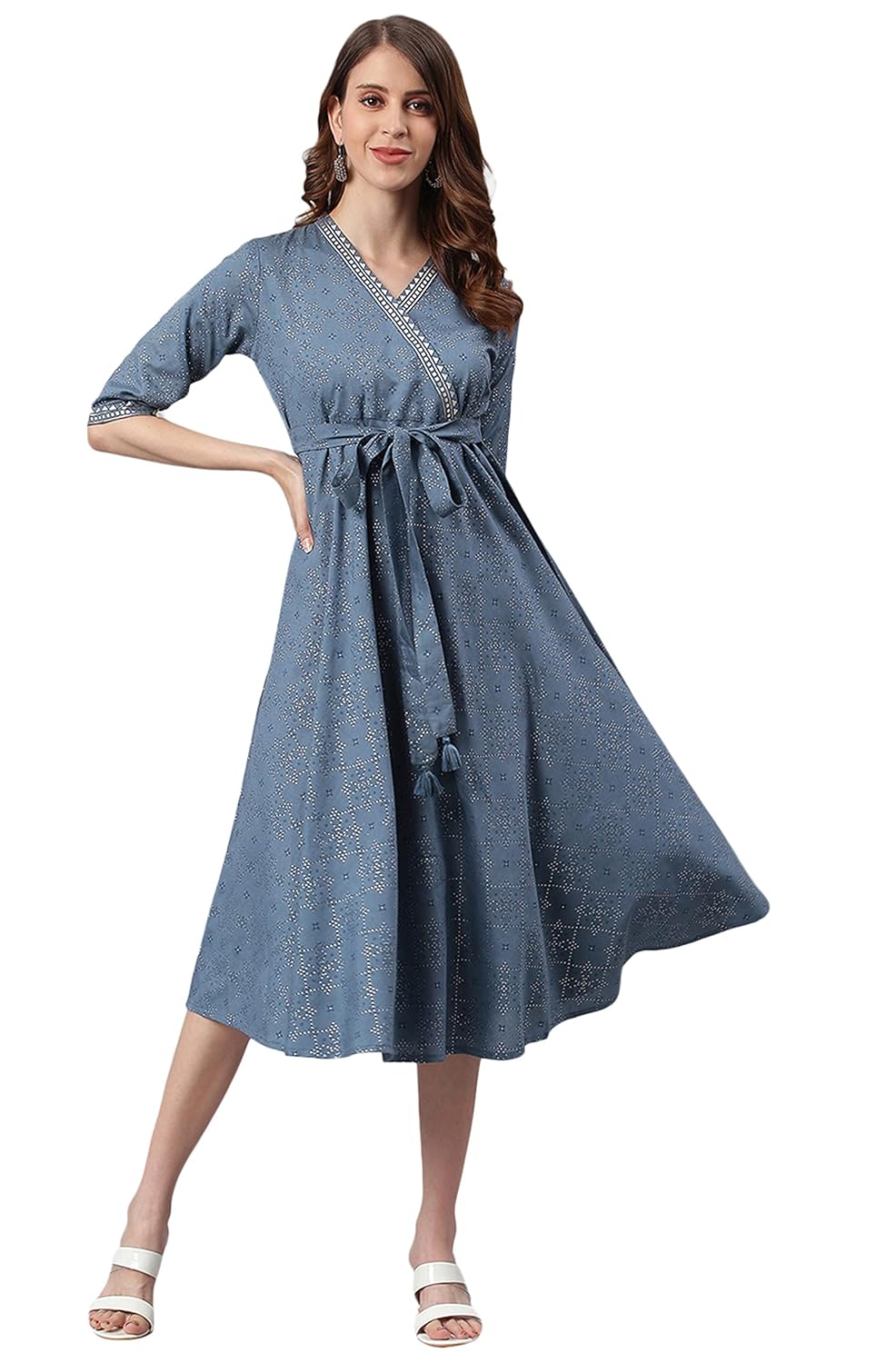 - Style: Flared 45" length Ethnic Dress with 3/4 Sleeve