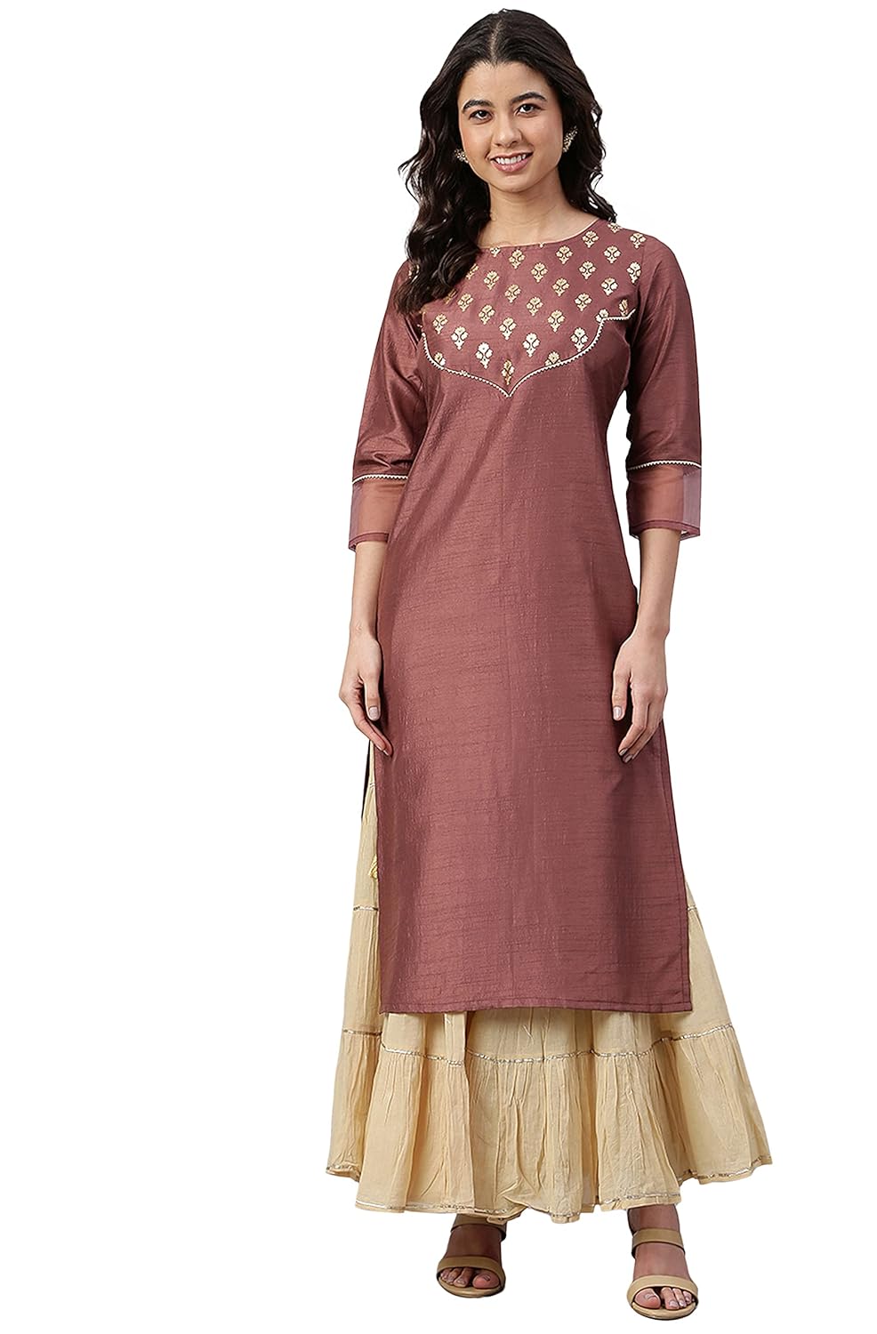 - Elevate your casual look with this stylish Brown Poly Silk Kurta, featuring an elegant foil print pattern. Its straight design, 3/4 regular sleeves, and a length of 47 inches make it perfect for casual occasions, adding a touch of sophistication to your ensemble.