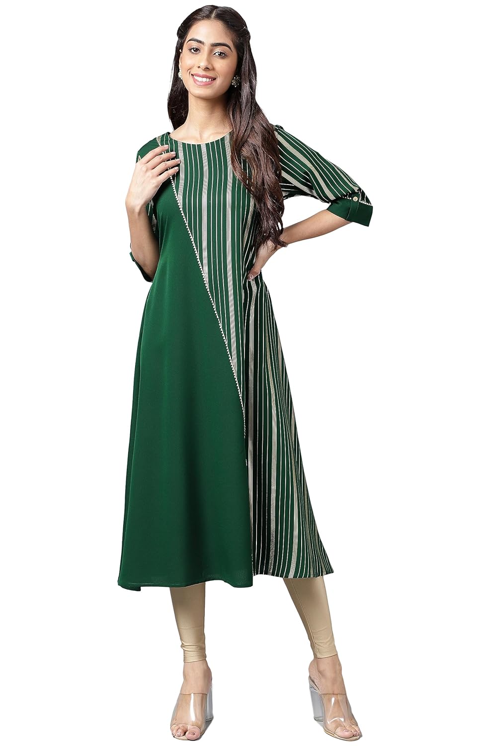 - Elevate your casual style with this stunning Dark Green A-Line Kurta. Crafted from comfortable and lightweight crepe material, this kurta features a beautiful foil print pattern and has a length of 43 inches.