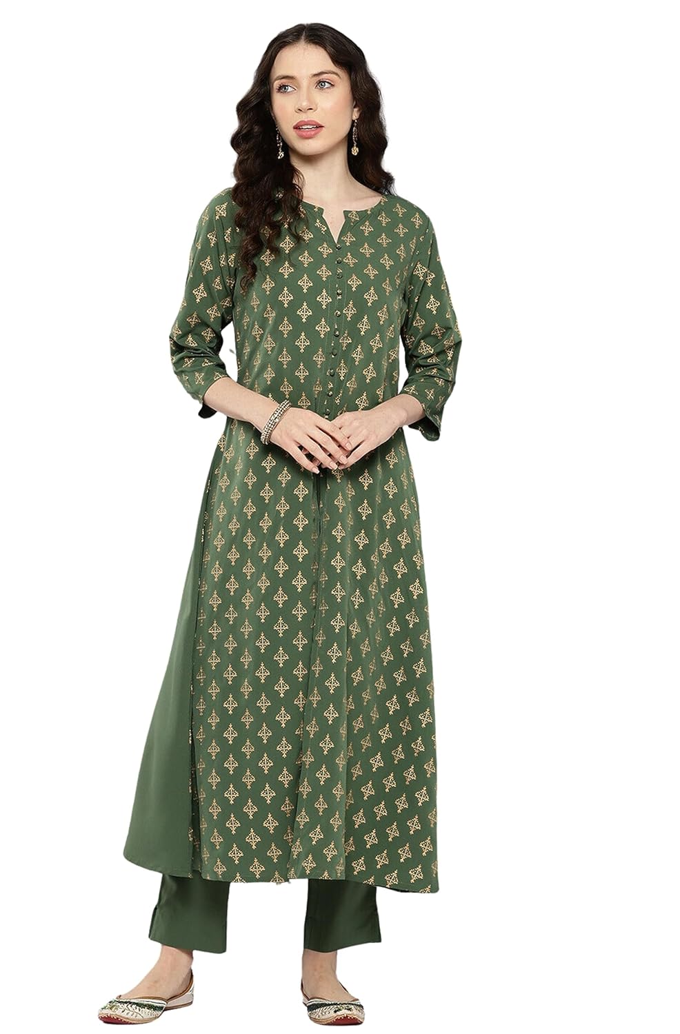 - Elevate your casual style with this two-piece ensemble featuring a Crepe Kurta and matching Crepe Pant in a vibrant green color with an eye-catching foil print. The A-line Kurta has a length of 45 inches, 3/4 sleeves, making it perfect for casual outings.