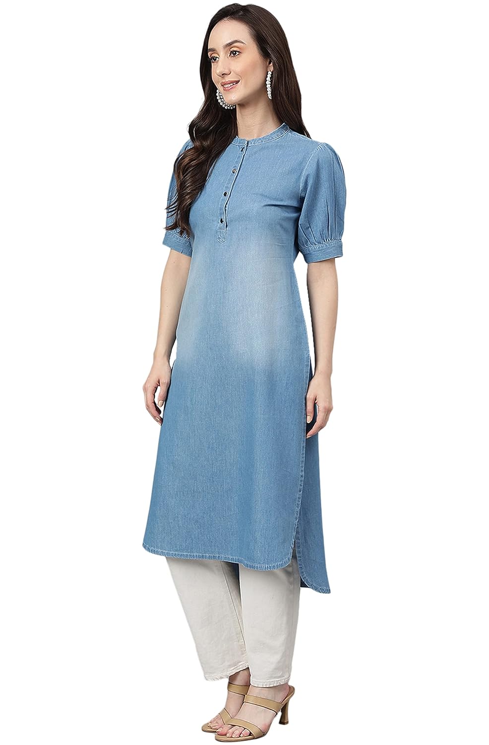 - Step out in style with this Light Blue High Low Kurta, crafted from 100% Cotton denim fabric for a comfortable and casual look. The kurta features a regular fit, half puff sleeves, and a length of 41 inches, making it perfect for casual occasions.
