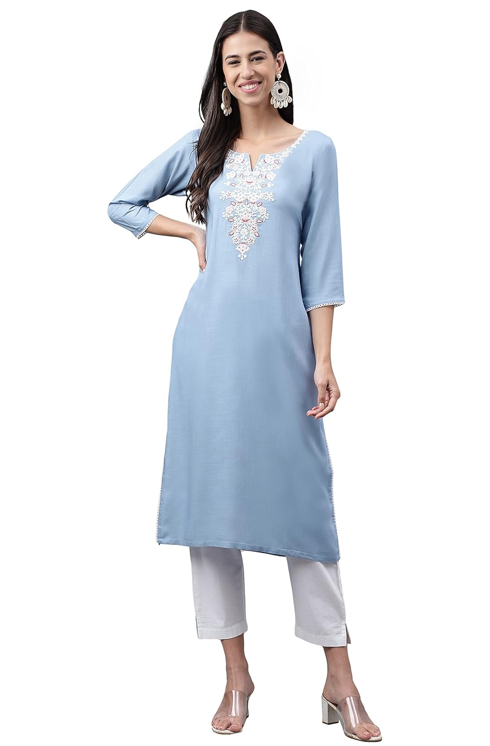 - Elevate your casual wardrobe with this Light Blue Rayon Kurta. With a classic Straight design, 3/4 sleeves, and a comfortable length of 45 inches, this solid-patterned kurta is perfect for casual occasions.