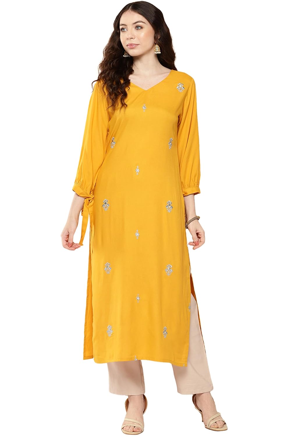 - Add a touch of elegance to your casual wardrobe with this beautiful mustard-colored rayon kurta.
