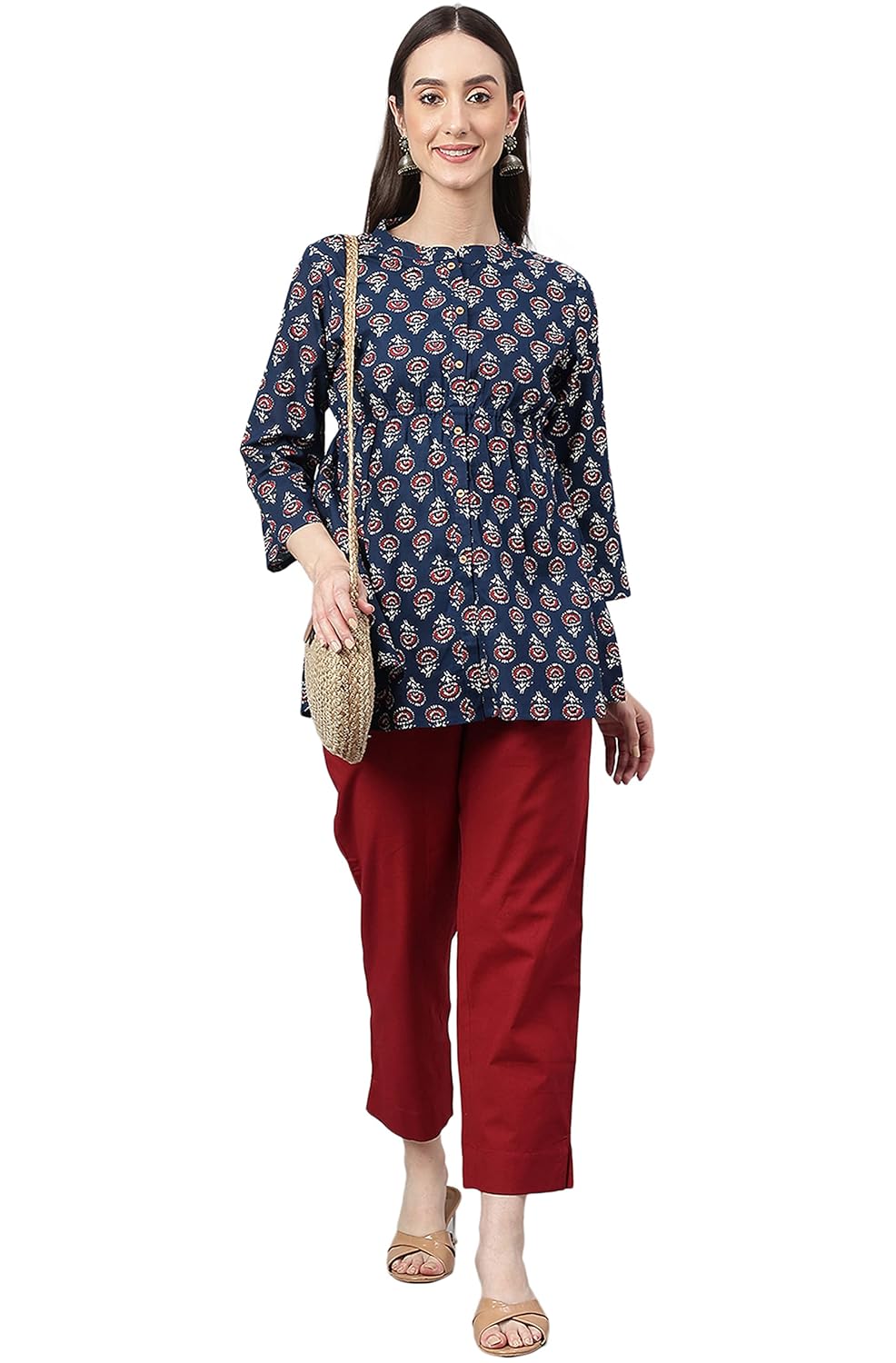 - Elevate your casual wardrobe with this delightful Flared Tunic in a rich Navy Blue hue, adorned with an intricate Floral Block Print pattern and classic 3/4 Regular Sleeves.