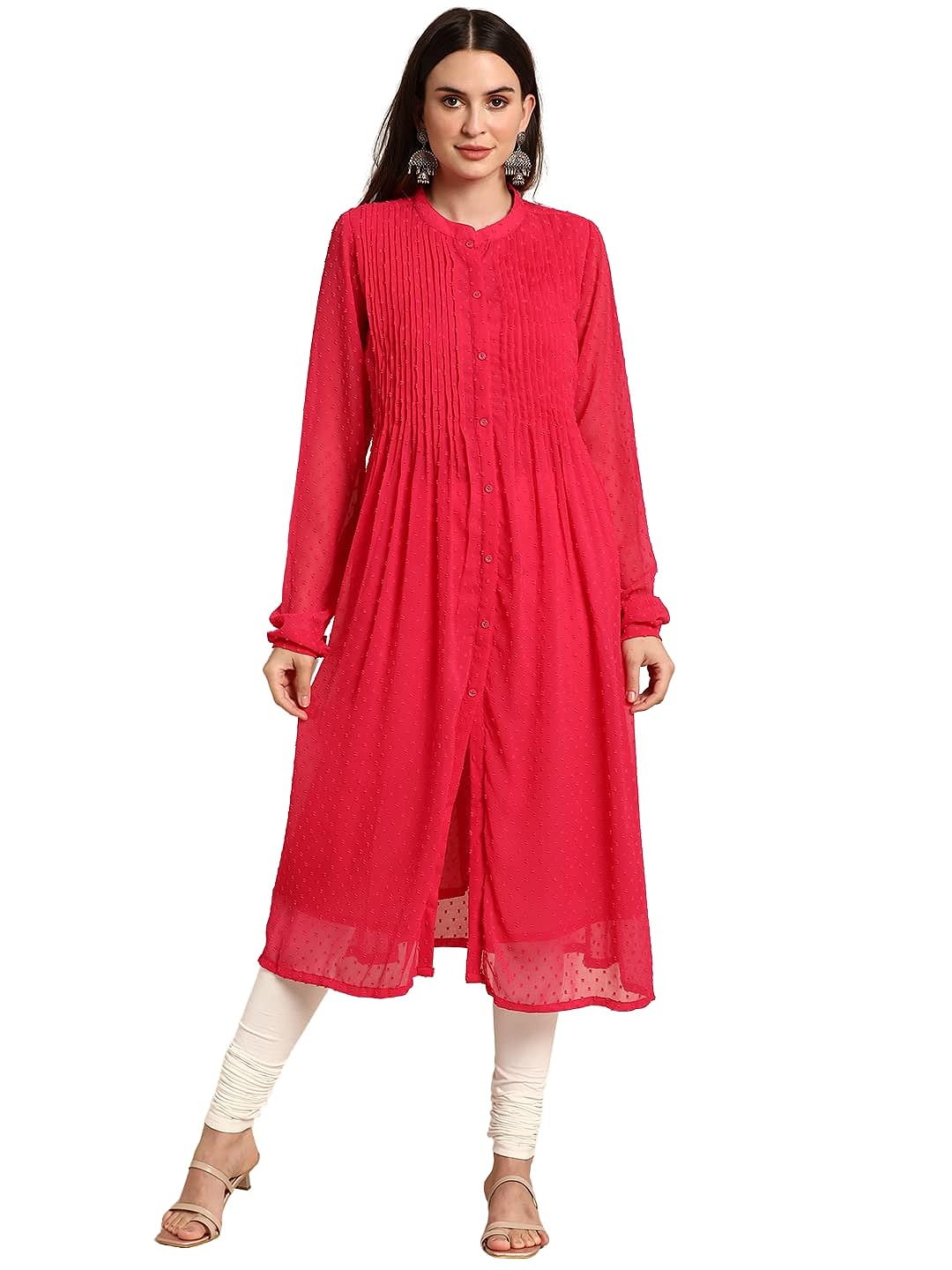 - Elevate your casual style with this pink frontslit kurta, made from comfortable poly chiffon fabric. It features a self-design pattern and full regular sleeves for a chic look.