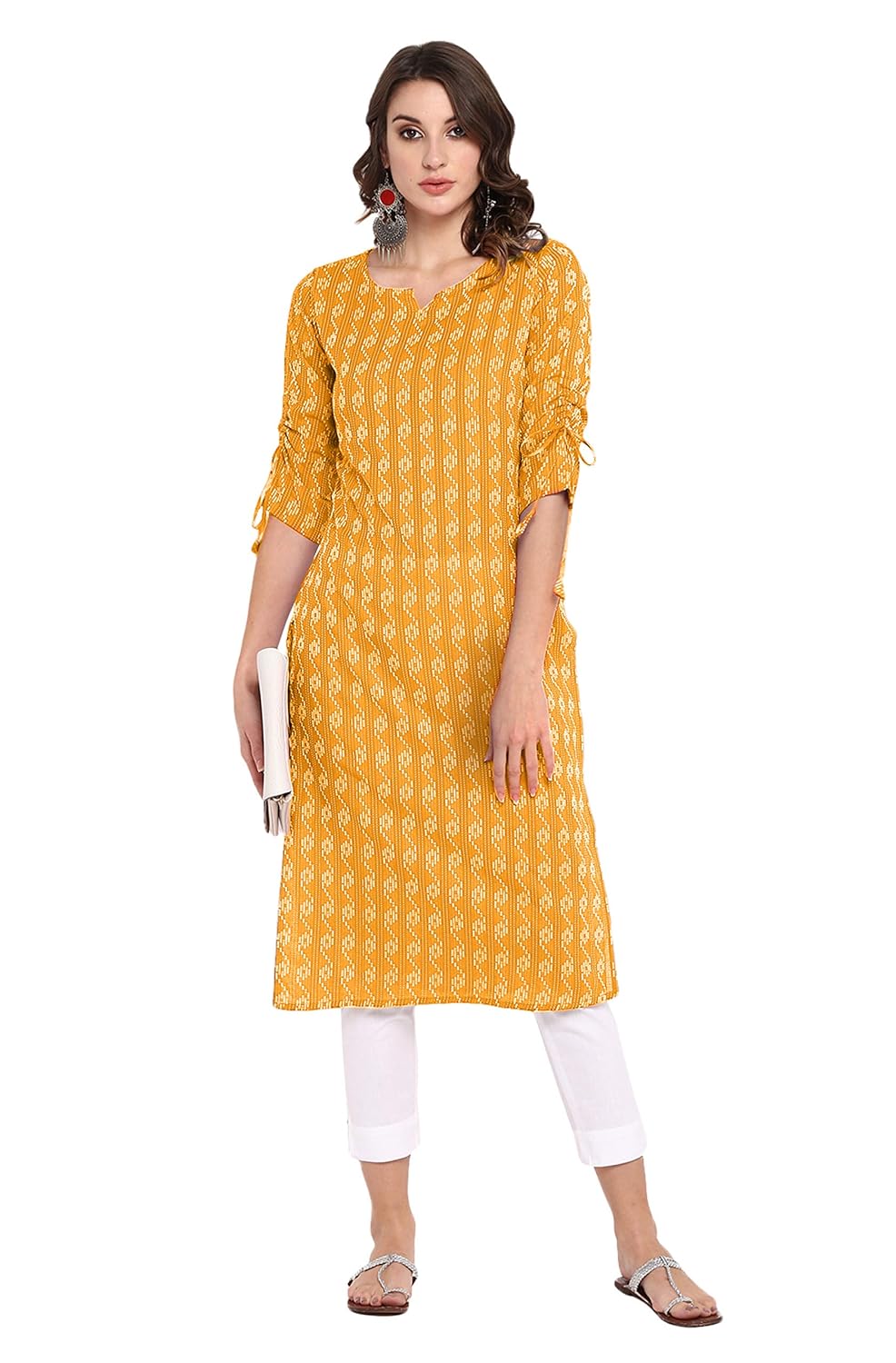 - Add a pop of sunshine to your casual wardrobe with this Yellow Straight Kurta featuring a charming woven design pattern. This readymade kurta boasts a regular fit, 3/4 sleeves, and a 44-inch length, making it an ideal choice for casual occasions.