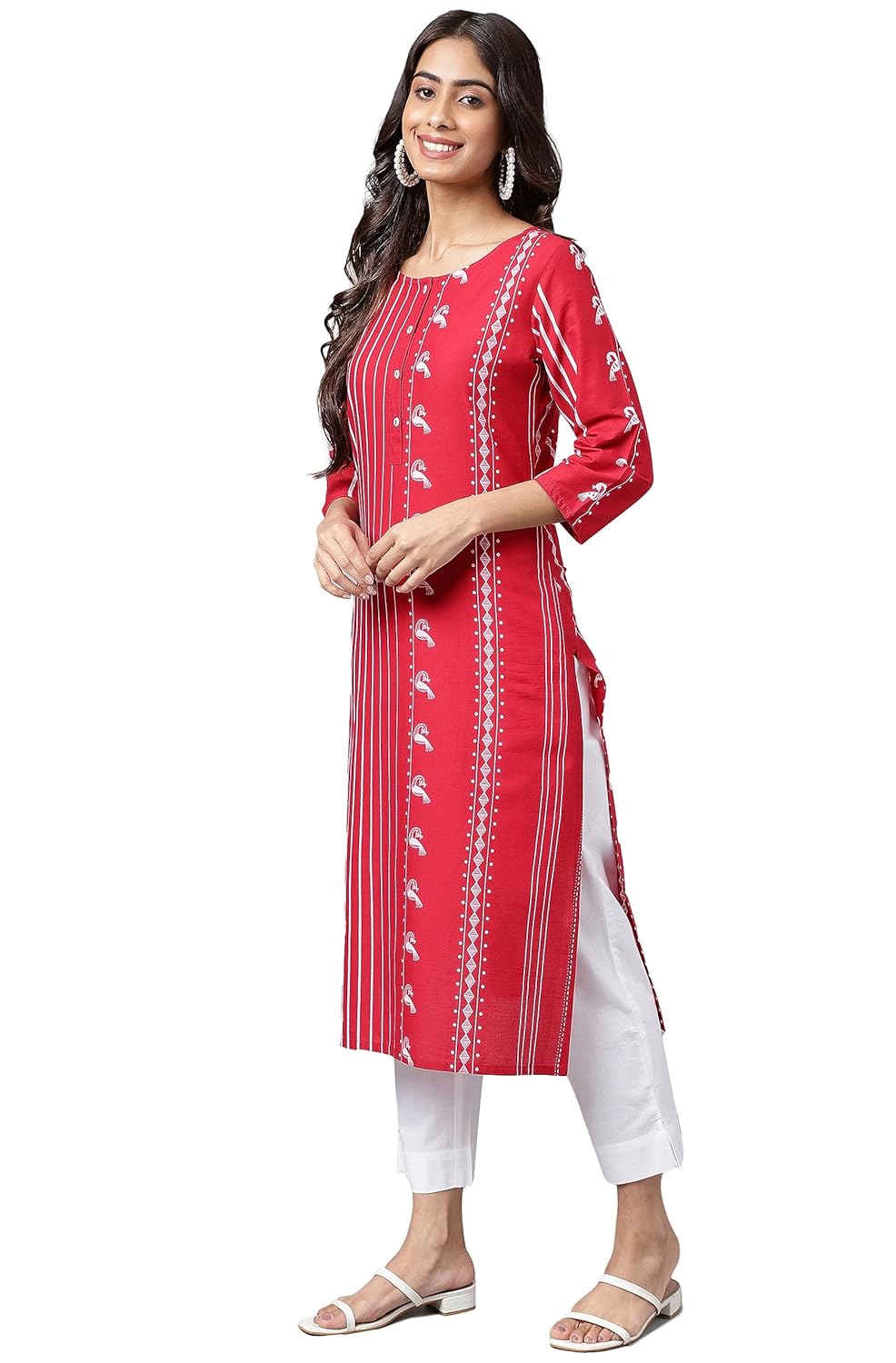 - Elevate your casual attire with this Readymade Cotton Kurta, featuring ethnic motif prints in a vibrant red color. With a length of 44 inches and 3/4 sleeves, this straight-cut kurta is ideal for everyday casual wear.