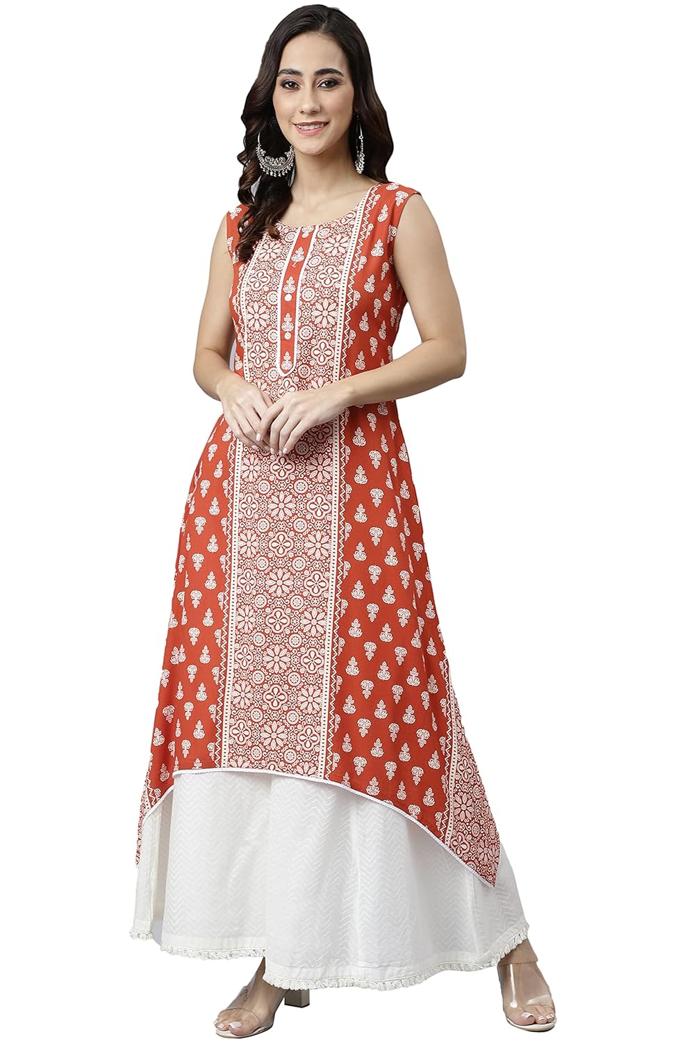 - Step out in style with this 41-inch A-line kurta in a beautiful rust color.