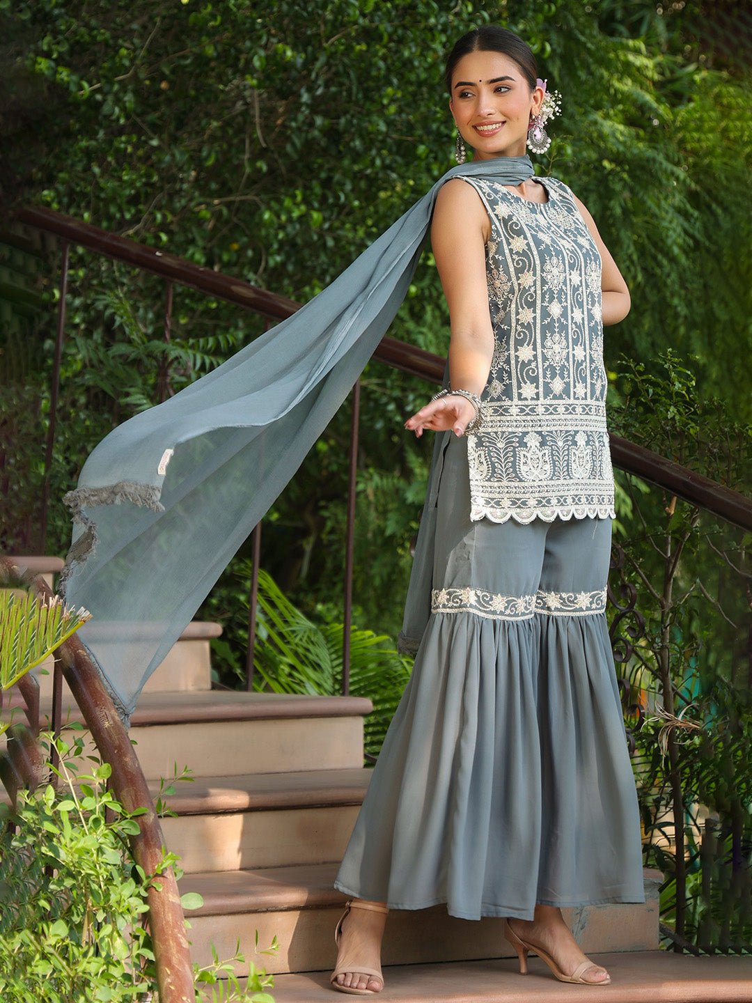 Juniper Women Grey Ethnic Motifs Embroidered Sequinned Kurta with Sharara & Dupatta