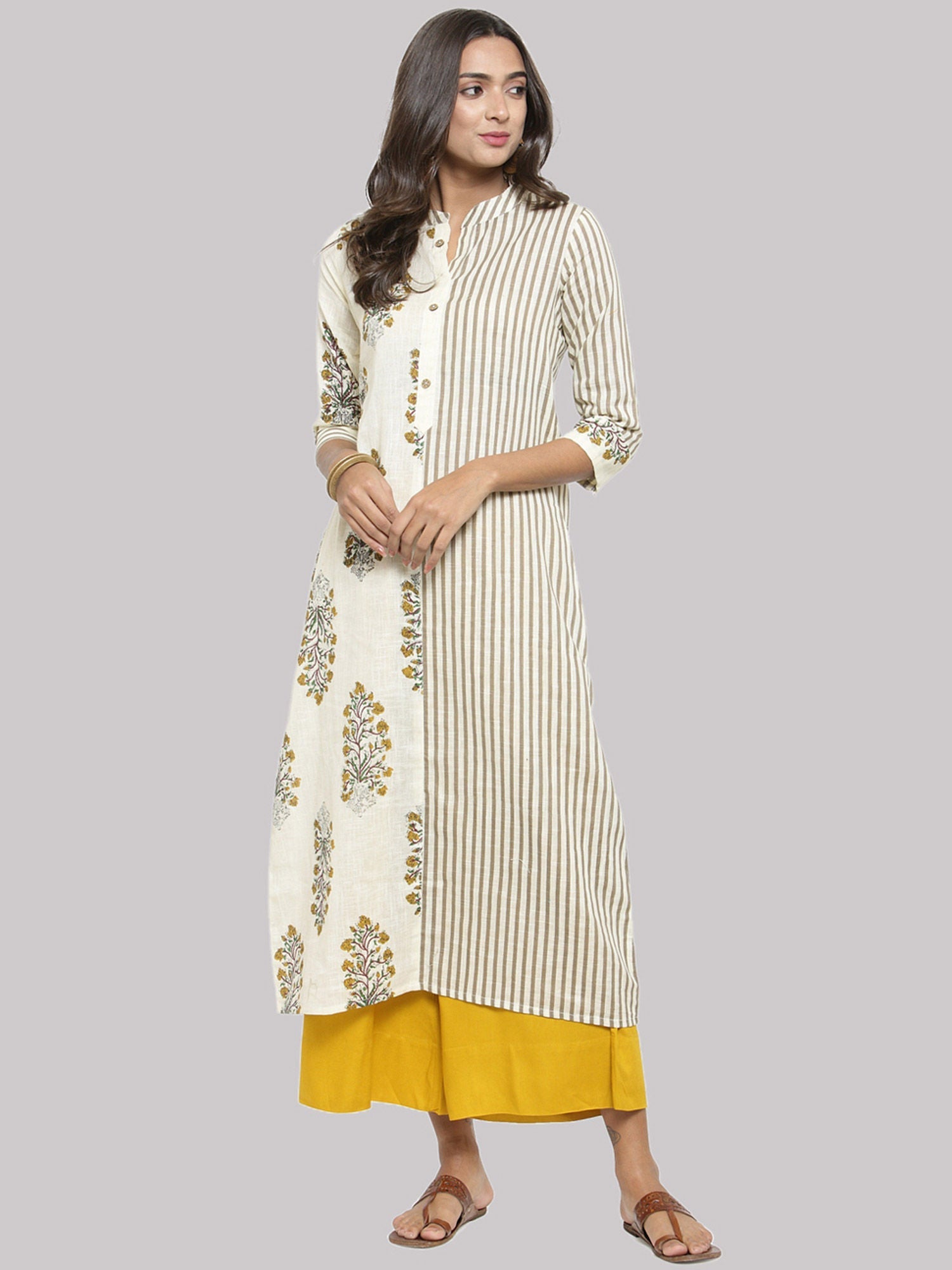 - Style this kurta with palazzo pants and brown flats for a complete and chic look, showcasing a perfect blend of comfort and fashion.