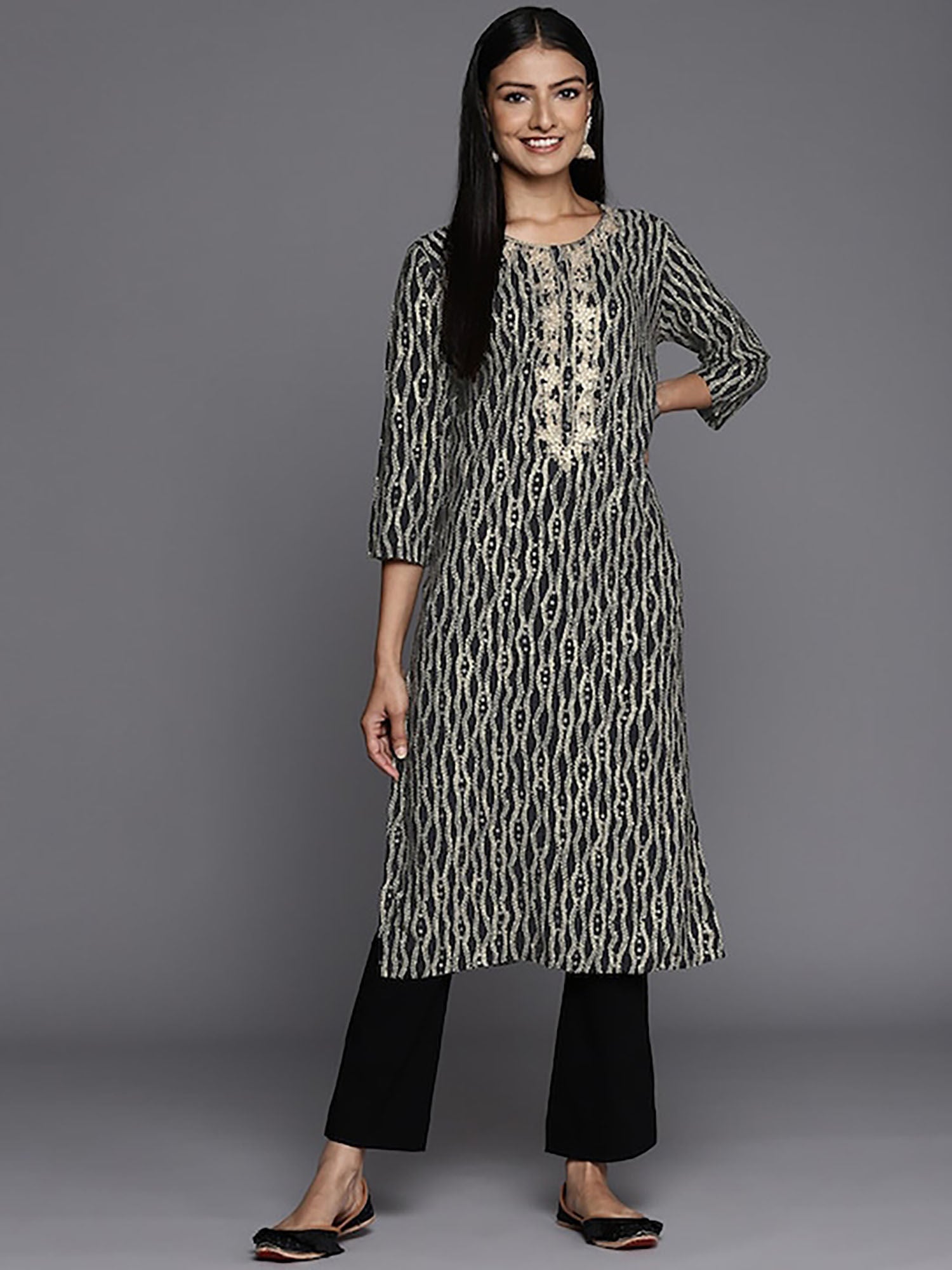 - Elevate your festive wardrobe with this printed and embroidered kurta from KSUT. The combination of prints and intricate embroidery adds a touch of sophistication to the classic design.