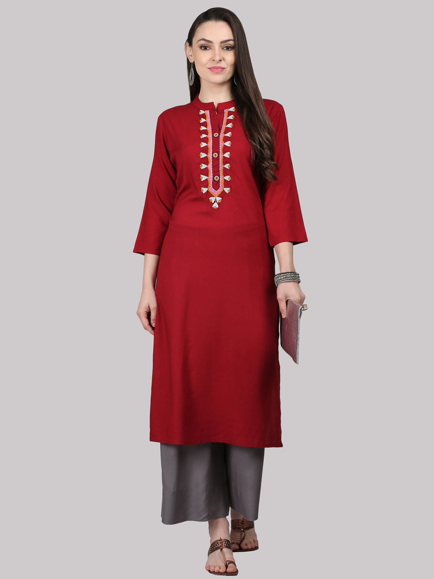 - The mandarin neck and three-fourth sleeves enhance its elegant design, making it a must-have for casual occasions. Style this kurta with palazzo pants and brown flats to complete a chic and comfortable look.